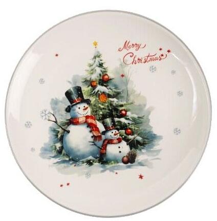 Bájos, hóemberes karácsonyi kerámia lapostányér „Merry Christmas felirattal és feldíszített karácsonyfával.